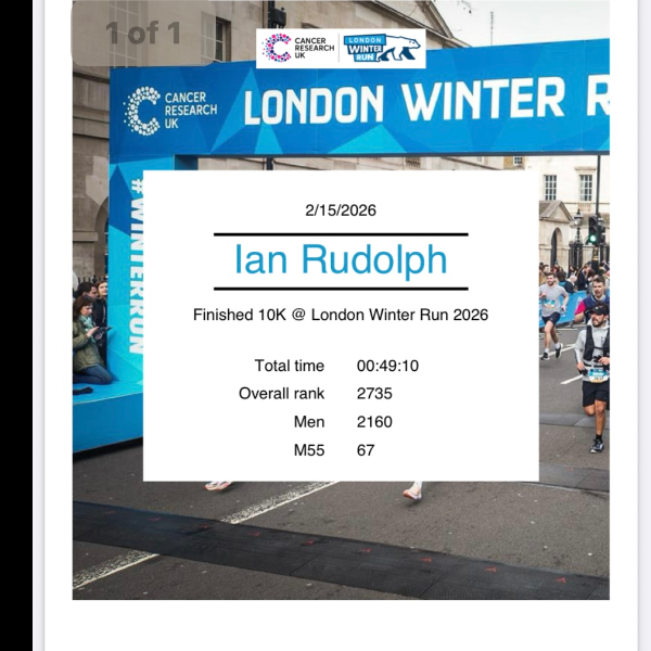 I just finished the Cancer Research UK London Winter Run 2026. It was wet before during and after and cold!